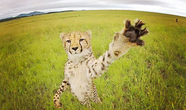 Ένα τσίτα προσπαθεί να πιάσει ένα drone που πετάει από πάνω του