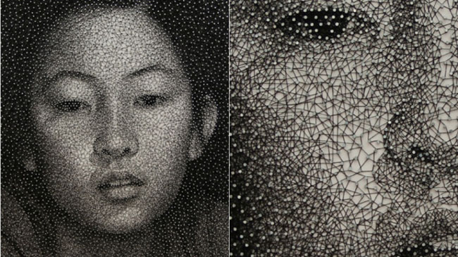 Μαύρη κλωστή περασμένη από καρφιά πάνω σε έναν λευκό τοίχο δημιουργεί ένα πορτρέτο