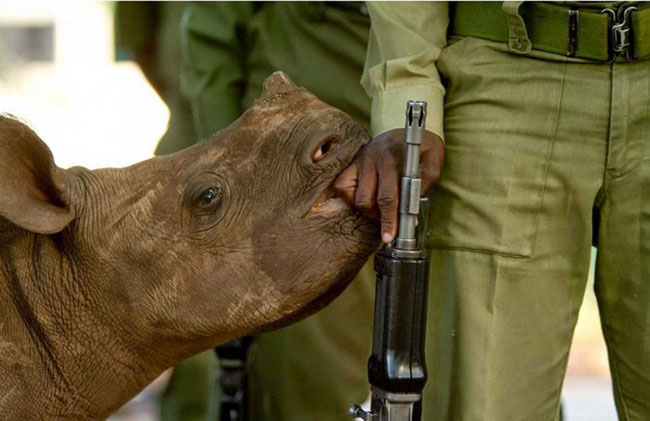 Ένα μωρό ρινόκερος και ο φύλακας του. Οι μαύροι ρινόκεροι πλέον φυλάσσονται από οπλισμένους στρατιώτες για να προστατευτούν από τους λαθροκυνηγούς. Τα ζώα βλέπουν τους στρατιώτες σαν μέλη της οικογένειας τους.