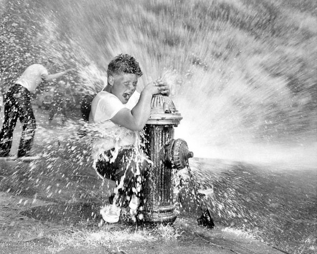 40.Νεαρός παίζει με έναν πυροσβεστικό κρουνό. Η αστυνομία έκανε εκστρατεία ενάντια στο αλόγιστο άνοιγμα των κρουνών, γιατί μειώνεται η πίεση του νερού και αυτό είναι επικίνδυνο για τους πυροσβέστες, Νέα Υόρκη 1959.