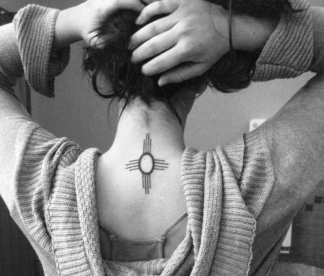 Ήλιος Zia = οι τέσσερις ακτίνες συμβολίζουν τις τέσσερις κατευθύνσεις (Β, Ν, Α, Δ)και τις τέσσερις εποχές με τον κύκλο στη μέση να τα ενώνει