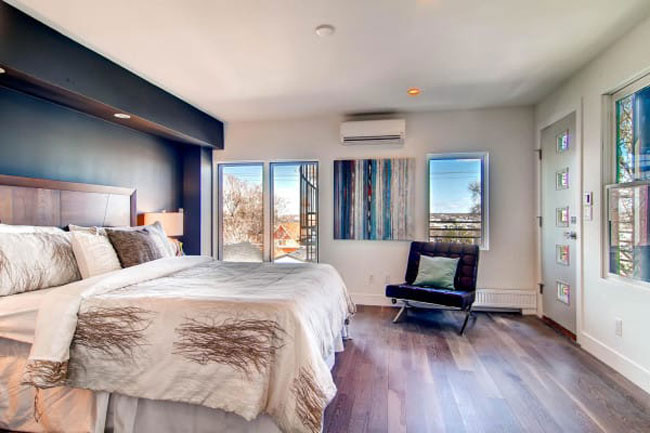 Στον επάνω όροφο, η κύρια κρεβατοκάμαρα έχει και μπαλκόνι που οδηγεί στην οροφή.